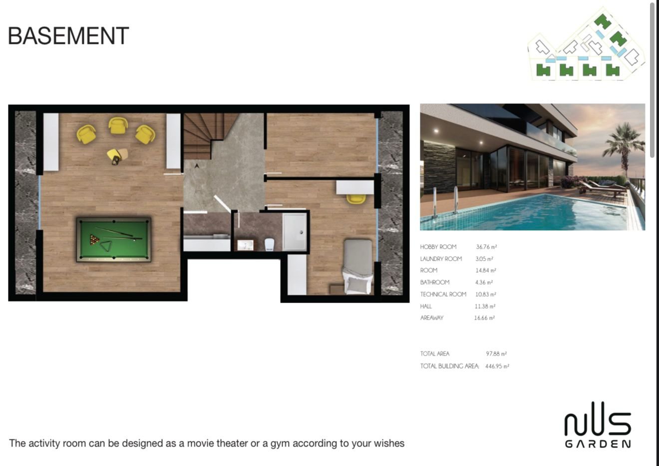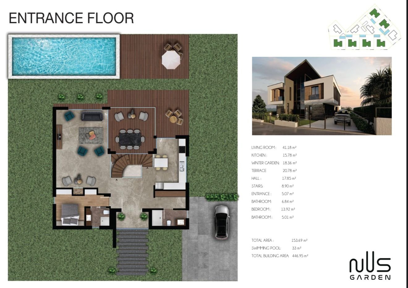 BAİ YAPI tarafından İzmir’in en prestijli bölgelerinden Güzelbahçe’de hayata geçirilen Nus Garden Evleri, 5100 m² arsa üzerinde konumlanan 10 adet müstakil ve bağımsız villadan oluşmaktadır.